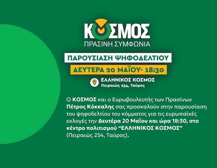 ΚΟΣΜΟΣ: Τη Δευτέρα 20 Μαΐου η παρουσίαση των υποψηφίων ευρωβουλευτών/τριών του ΚΟΣΜΟΥ